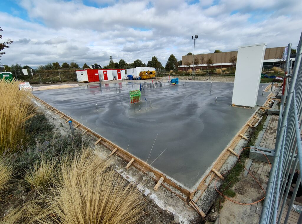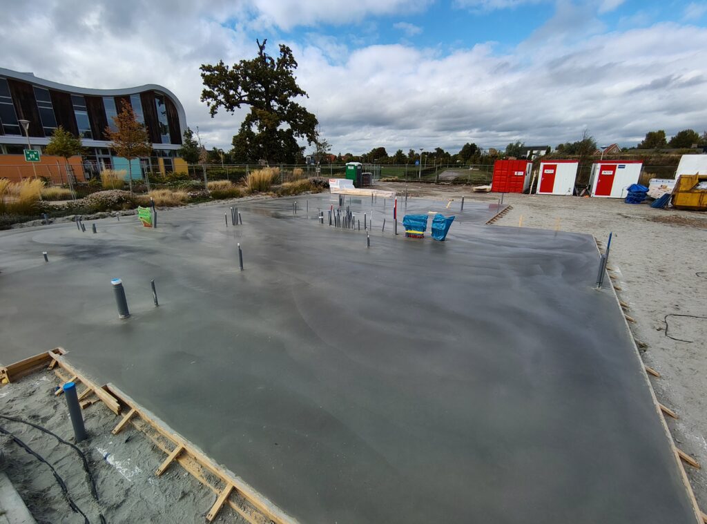 Vandaag is de vloer gestort en gevlinderd. Als alles volgens plan verloopt, begint de aannemer eind volgende week met het installeren van de prefab panelen!