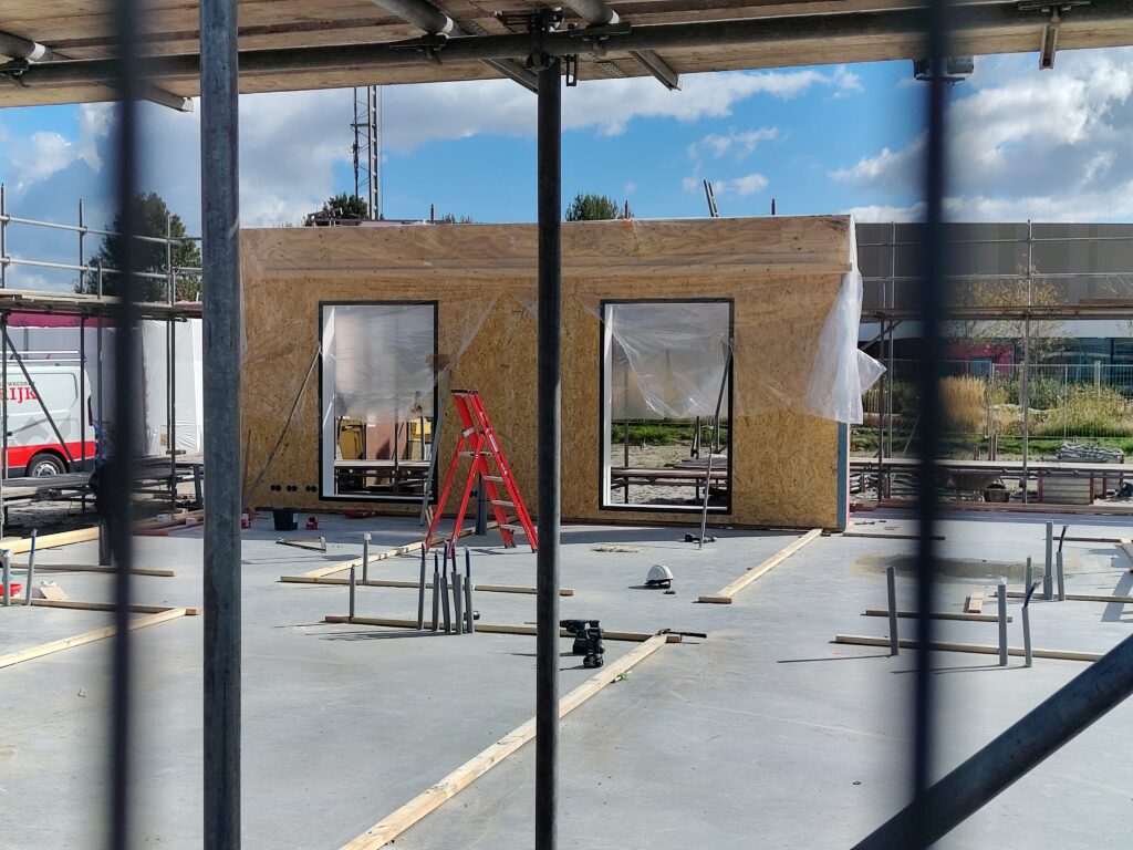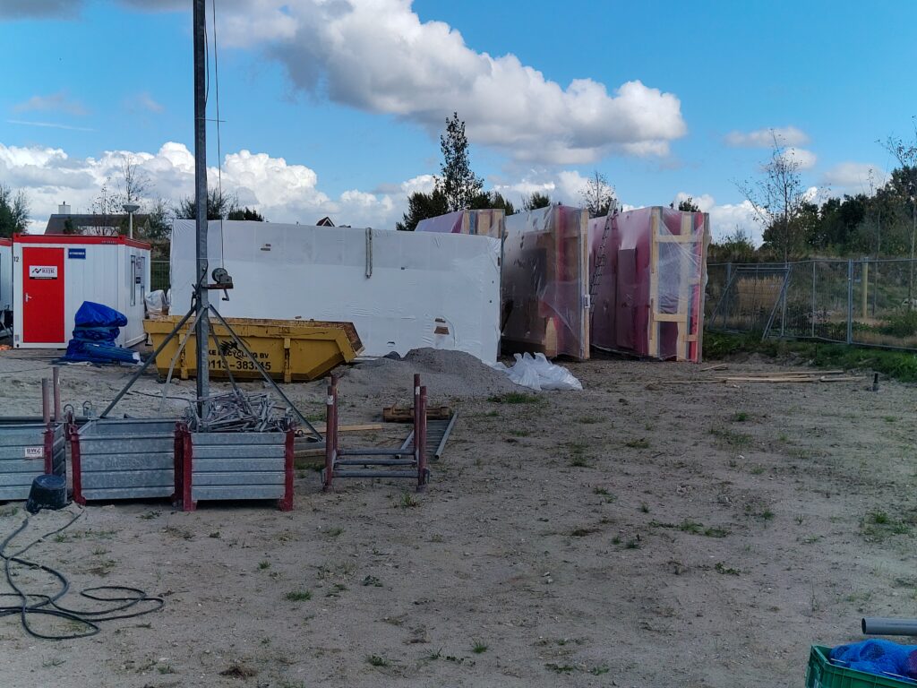 Het eerste paneel staat al overeind. De andere panelen staan klaar op de kavel. Vanaf morgen wordt in 3 dagen tijd het hele pand in elkaar gezet.